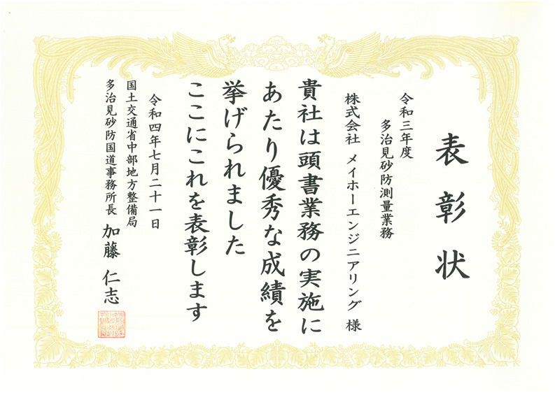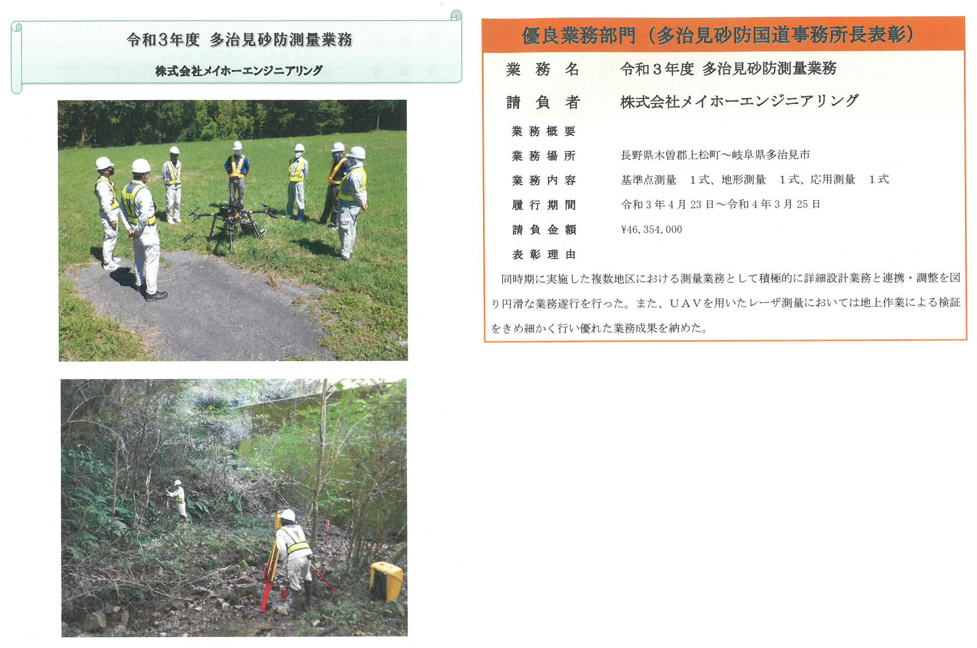 当社で受注した『令和3年度 多治見砂防測量業務』の優良業務表彰を受けました。