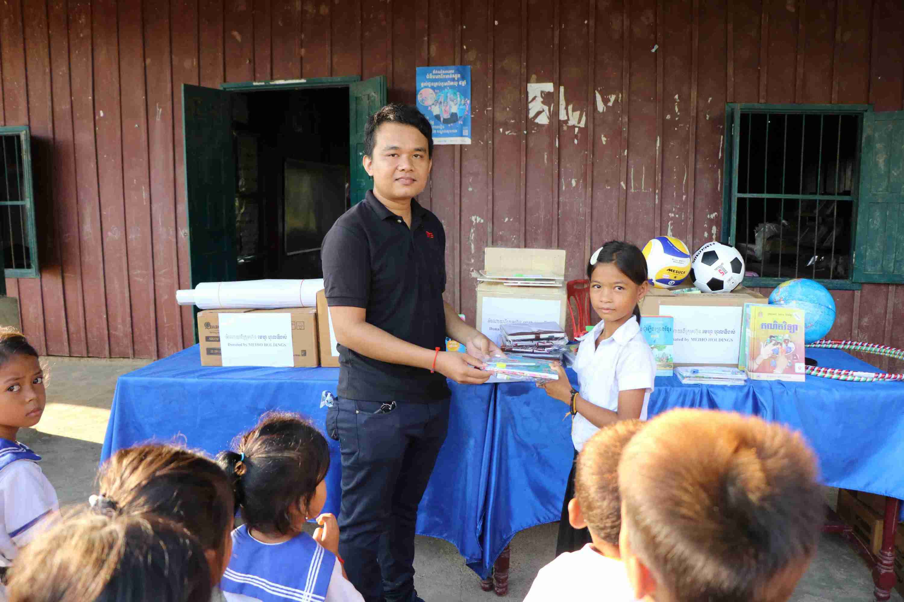 11月にカンボジア王国バンテアイメアンチェイ州サムラウン小学校(総生徒数:60名、教師:7名)に算数・科学を中心とした書籍の寄贈をしました。 当社プノンペン支店(カンボジア)のキムセイン支店長が小学校を訪問し、子供たちへ本を届けました。